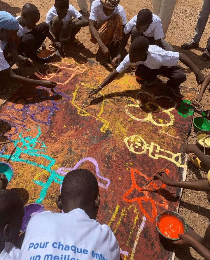 Un exemple marquant est sa toile Ganpèla. Elle est née d’un atelier qu’il a animé dans une école sous paillotte du village de Ganpèla, près de Ouagadougou. Il y a travaillé avec des enfants déplacés venus du nord du Burkina, fuyant la crise sécuritaire. Ensemble, ils ont peint leur école et créé autour du thème du déplacement, de l’exil et de l’espérance. De cette collaboration est née une œuvre où le mot-clé est clair : la paix, la solidarité, le vivre-ensemble.