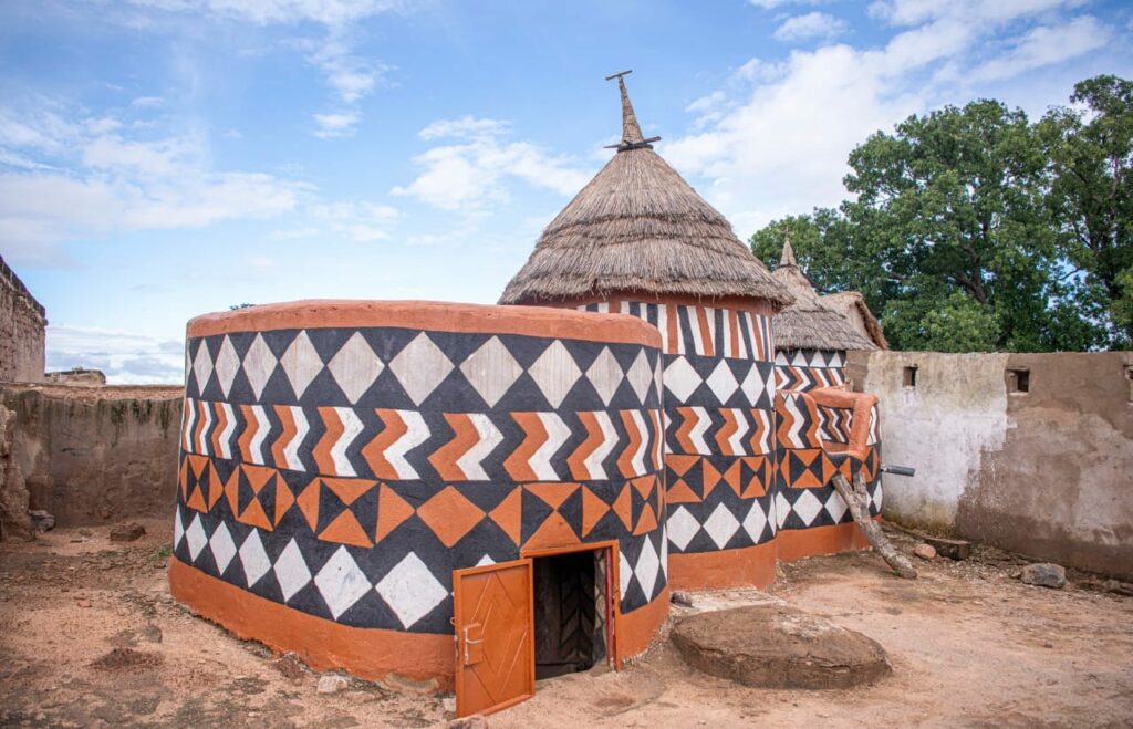 Mais si les hommes bâtissent, ce sont les femmes qui insufflent l’âme aux murs. À l’aide de pigments naturels comme le kaolin, le graphite et la latérite, elles dessinent, gravent et modèlent des fresques géométriques et symboliques. Cet art, transmis de génération en génération, constitue une mémoire de la communauté. « Chaque motif a un sens. Nous peignons pour raconter, pour protéger, pour transmettre », confie une aînée de la Cour.